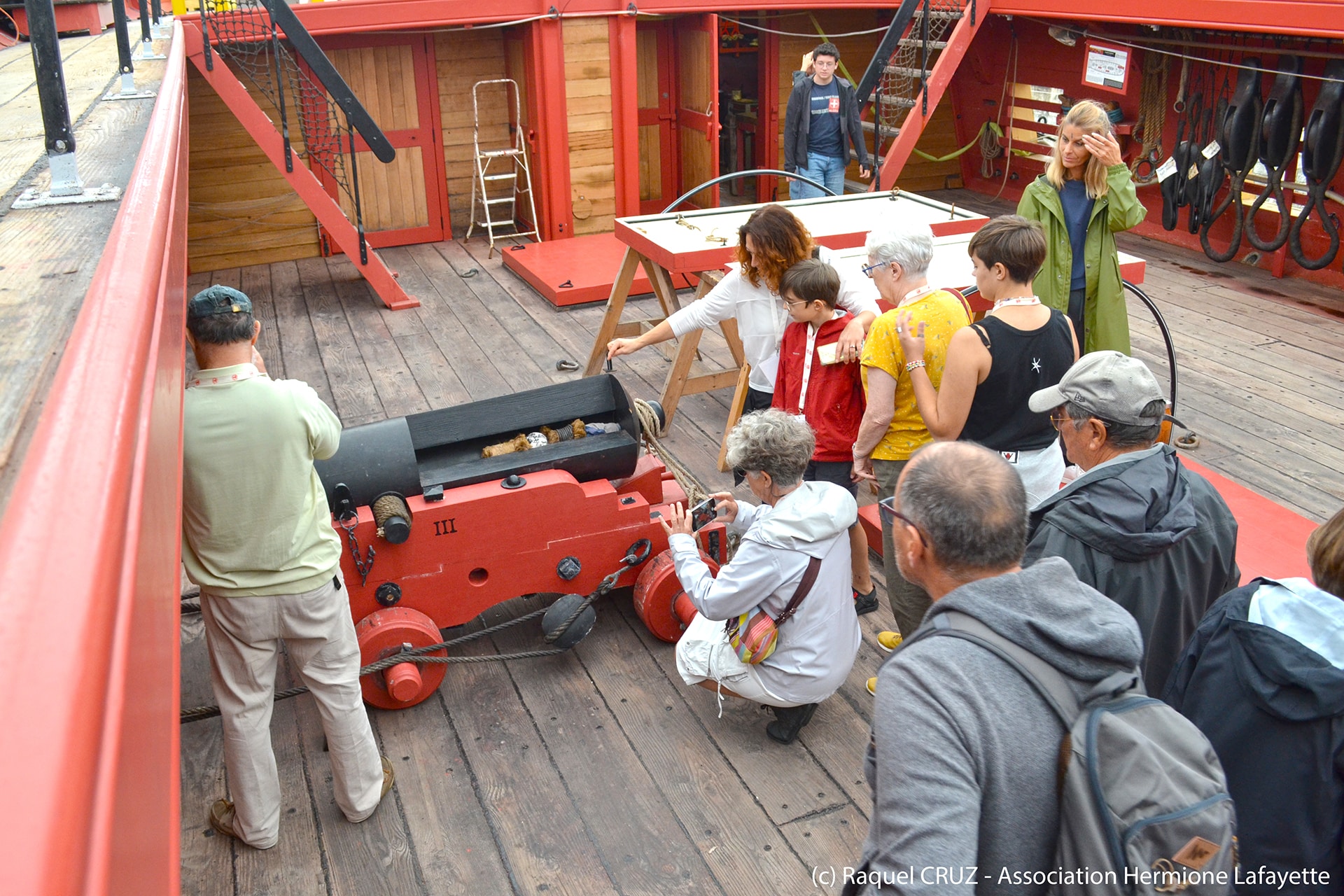 Venez découvrir le combat naval au temps de L’Hermione du 18e siècle et la manœuvre des canons sur un fac simulé d’une bouche à feu de 12 livres à bord de la frégate.