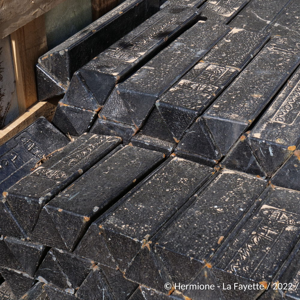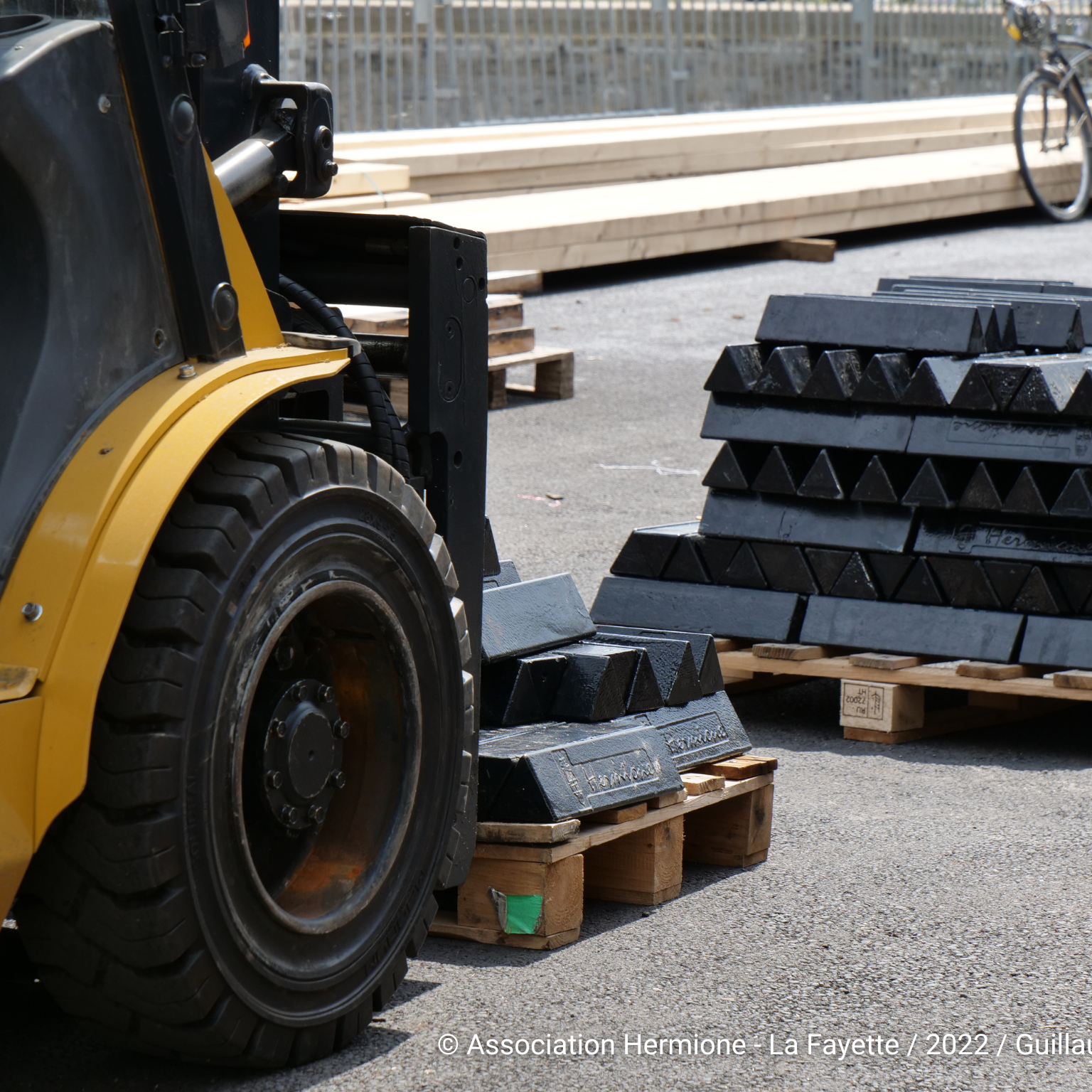 Le lest ce sont des lingots de fonte (un lingot pèse 12 kg) et des pavés de granit, qui permettent au navire de rester stable en navigation. L’Hermione originale en comptait 120 tonnes, plus du lest mobile (constitué du chargement, tonneaux, canons etc.) qui variait de 85 à 180 tonnes. L’Hermione d’aujourd’hui compte environ 227,3 tonnes de lests. En 2022 une première partie a été retirée à l’avant et à l’arrière du navire pour permettre la restauration des zones atteintes par les champignons : ce sont 133,4 tonnes qui ont été retirées par nos bénévoles.