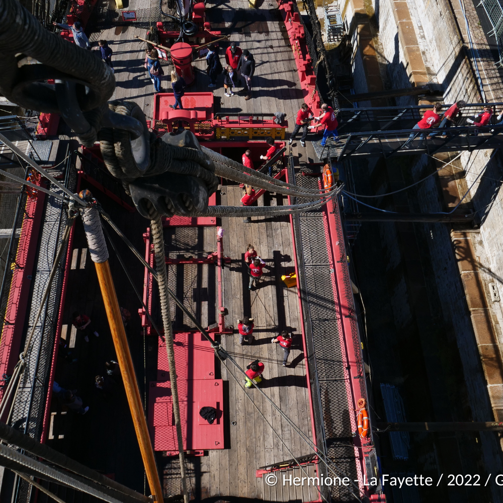 Cette année, L’Hermione doit se libérer d’une autre partie de son lest situé en fond de cale. Cela va permettre de soulager la coque et l’ensemble de la structure du navire en Grand Carénage à Anglet depuis septembre 2021.