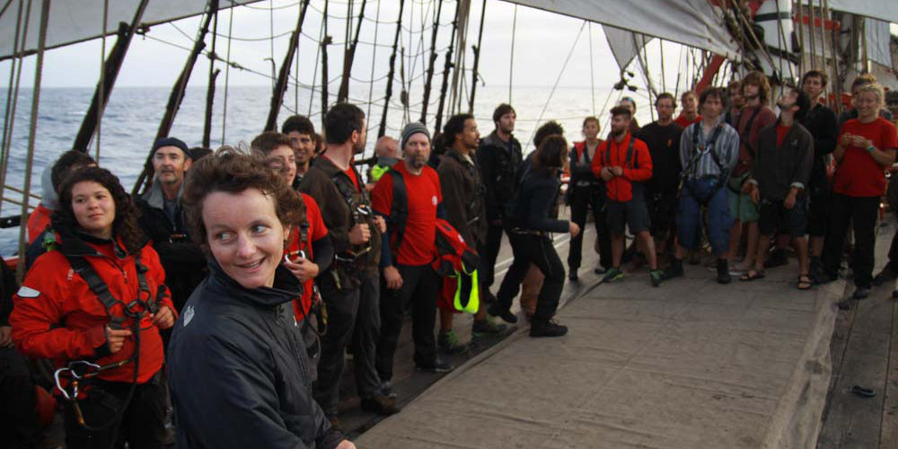 La journée a été difficile pour quelques volontaires, car nous sommes moins appuyés donc roulons beaucoup plus dans une houle croisée venant du Nord-Ouest et du Nord-Est. Si ces conditions sont propices à de jolies images, elles sont également exigeantes pour le gréement. Ridage des haubans et protection des points de friction étaient donc au programme pour les gabiers aujourd’hui.