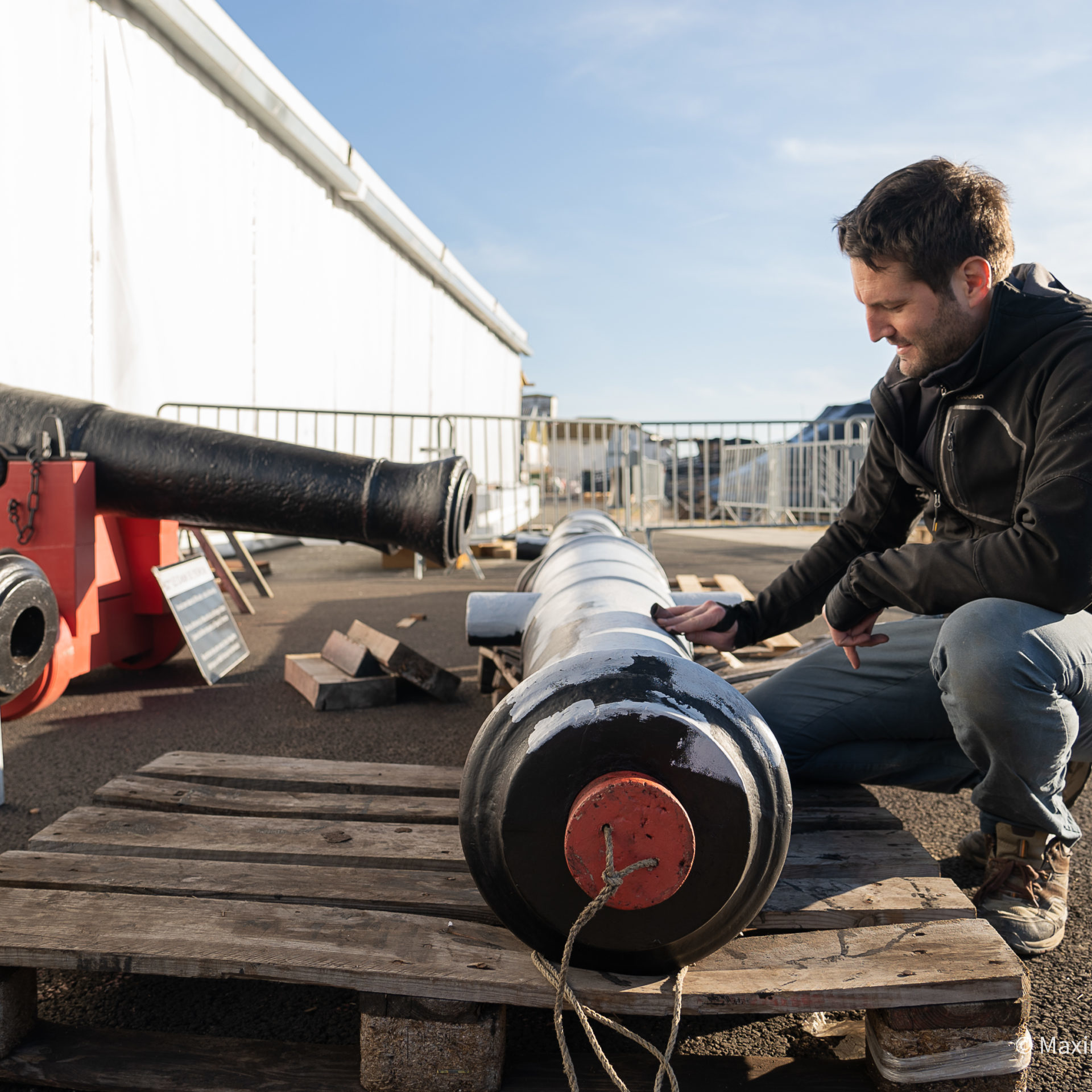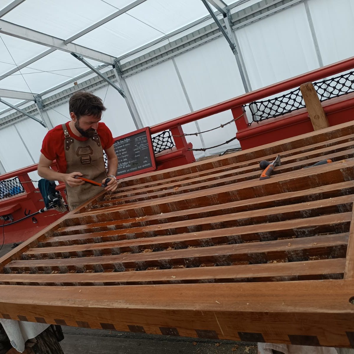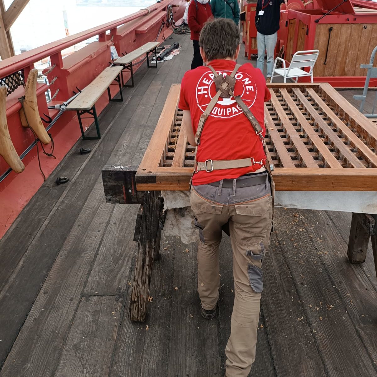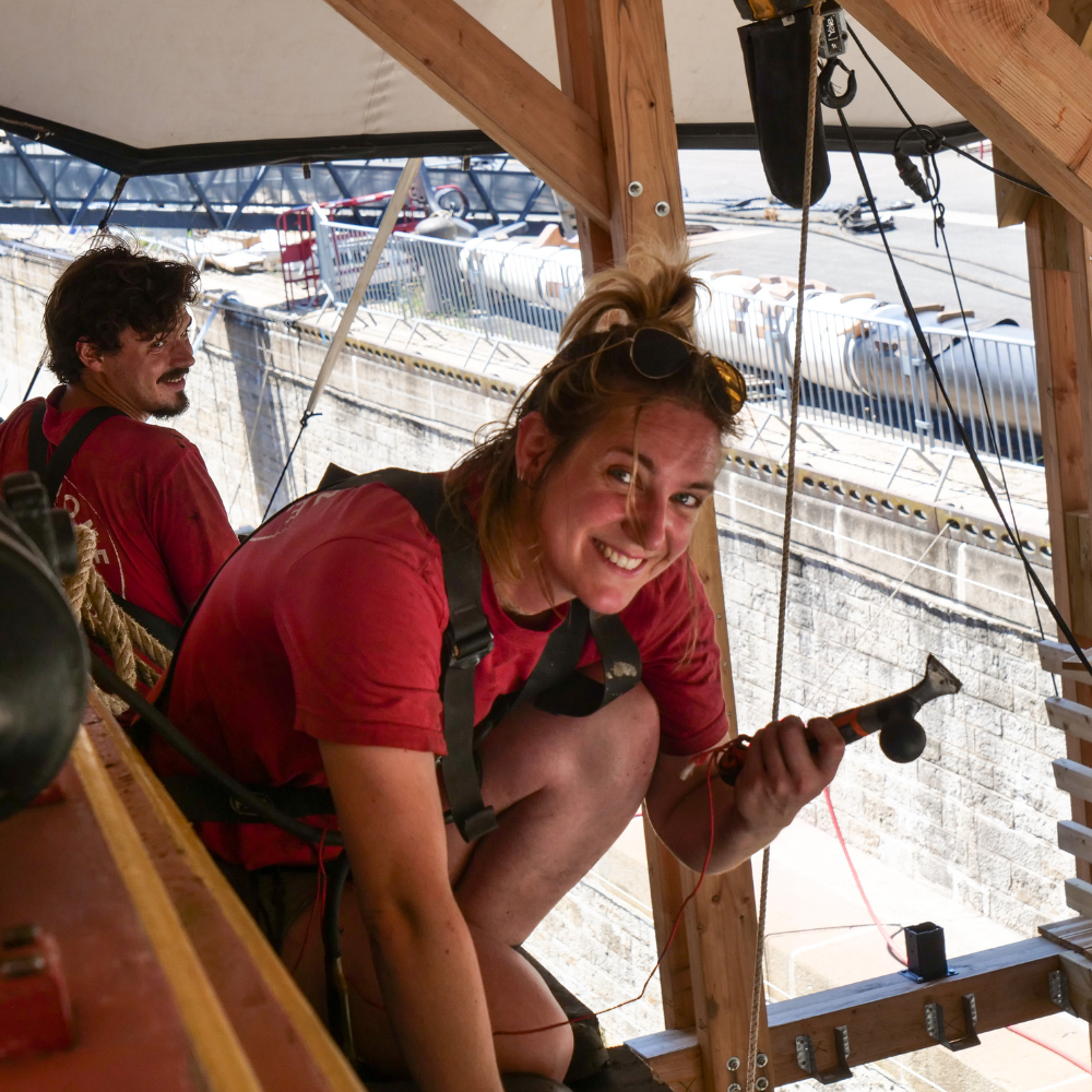 Ils travaillent actuellement à l’entretien du faux étai du grand hunier. Le saviez-vous ? Vous pouvez également devenir bénévole de l’Hermione et participer à la restauration de ce navire mythique. Plus d’informations ici.
