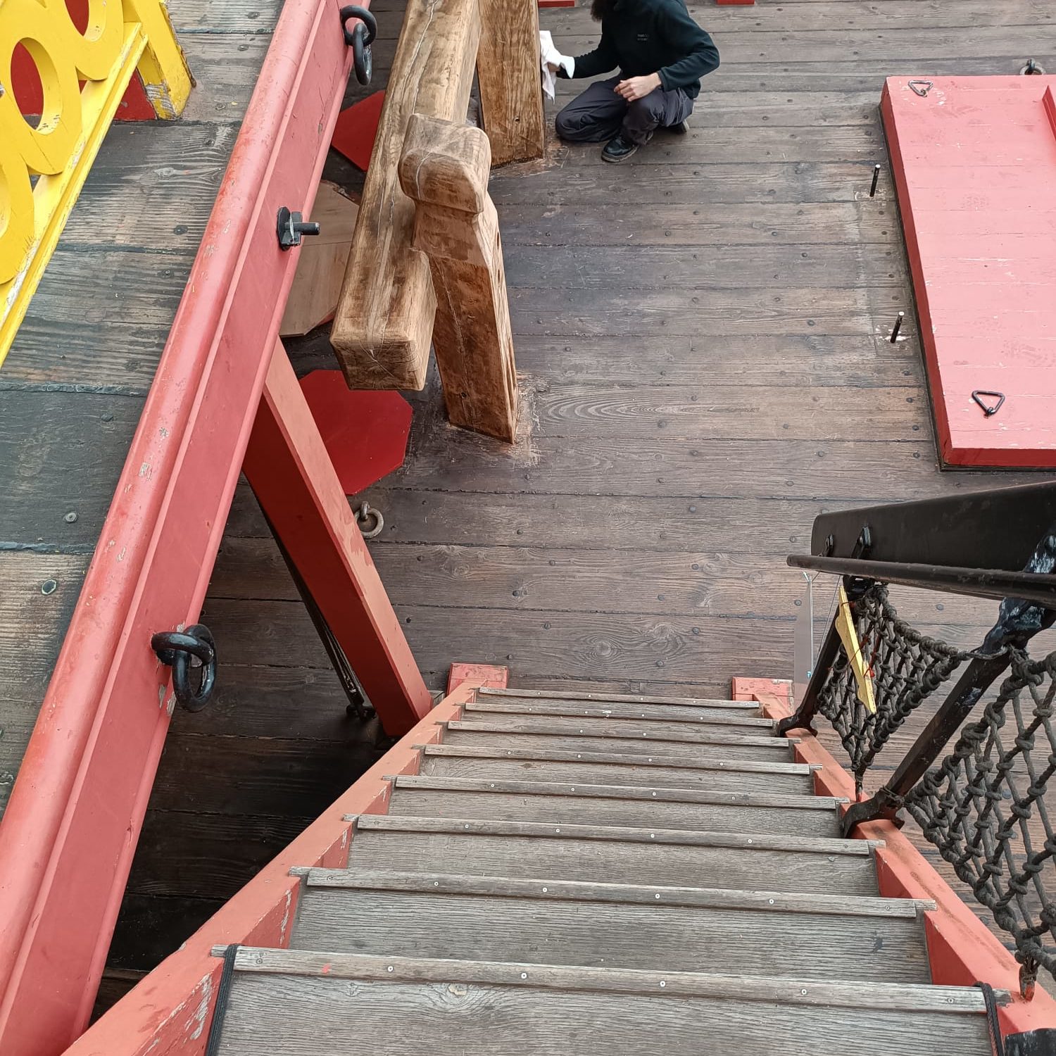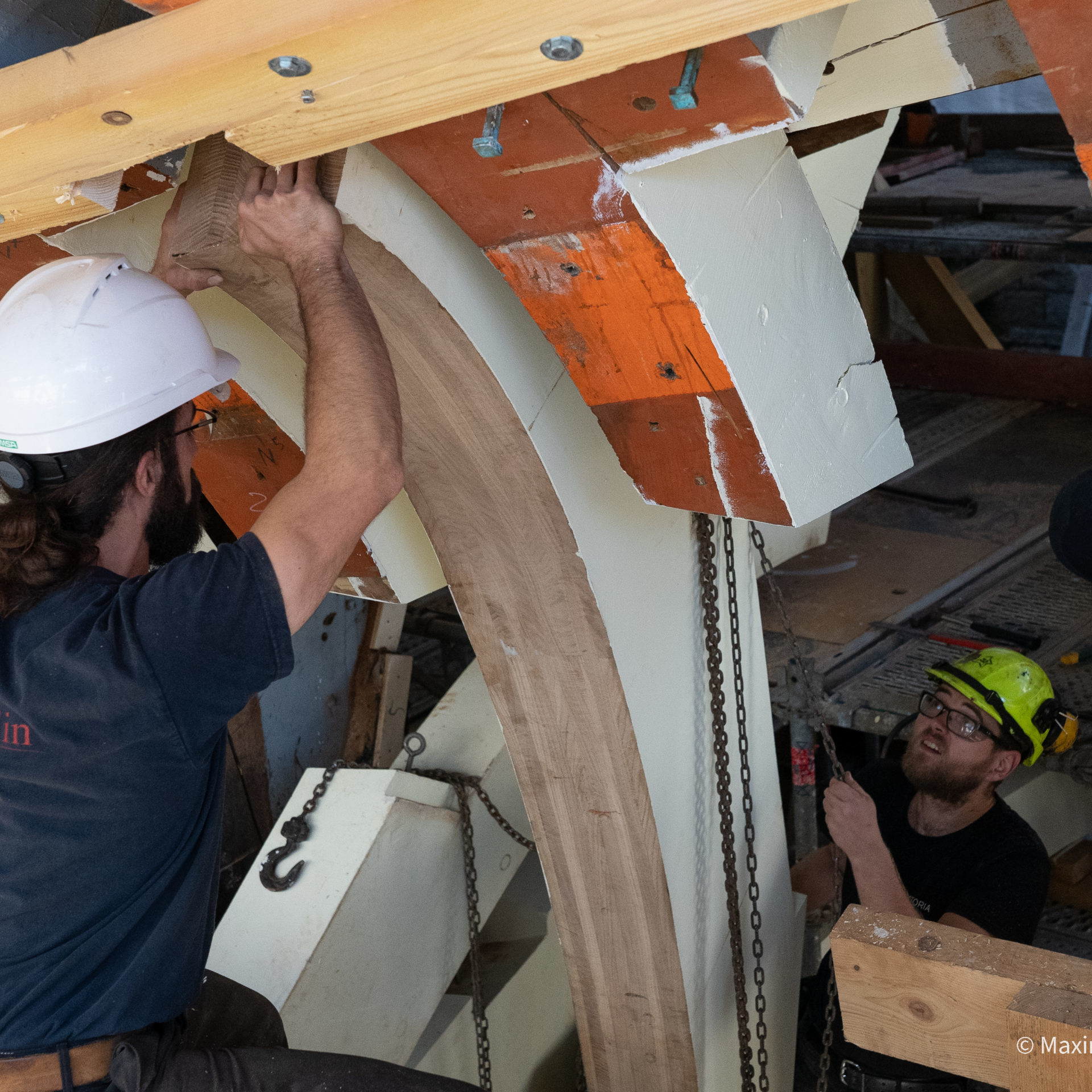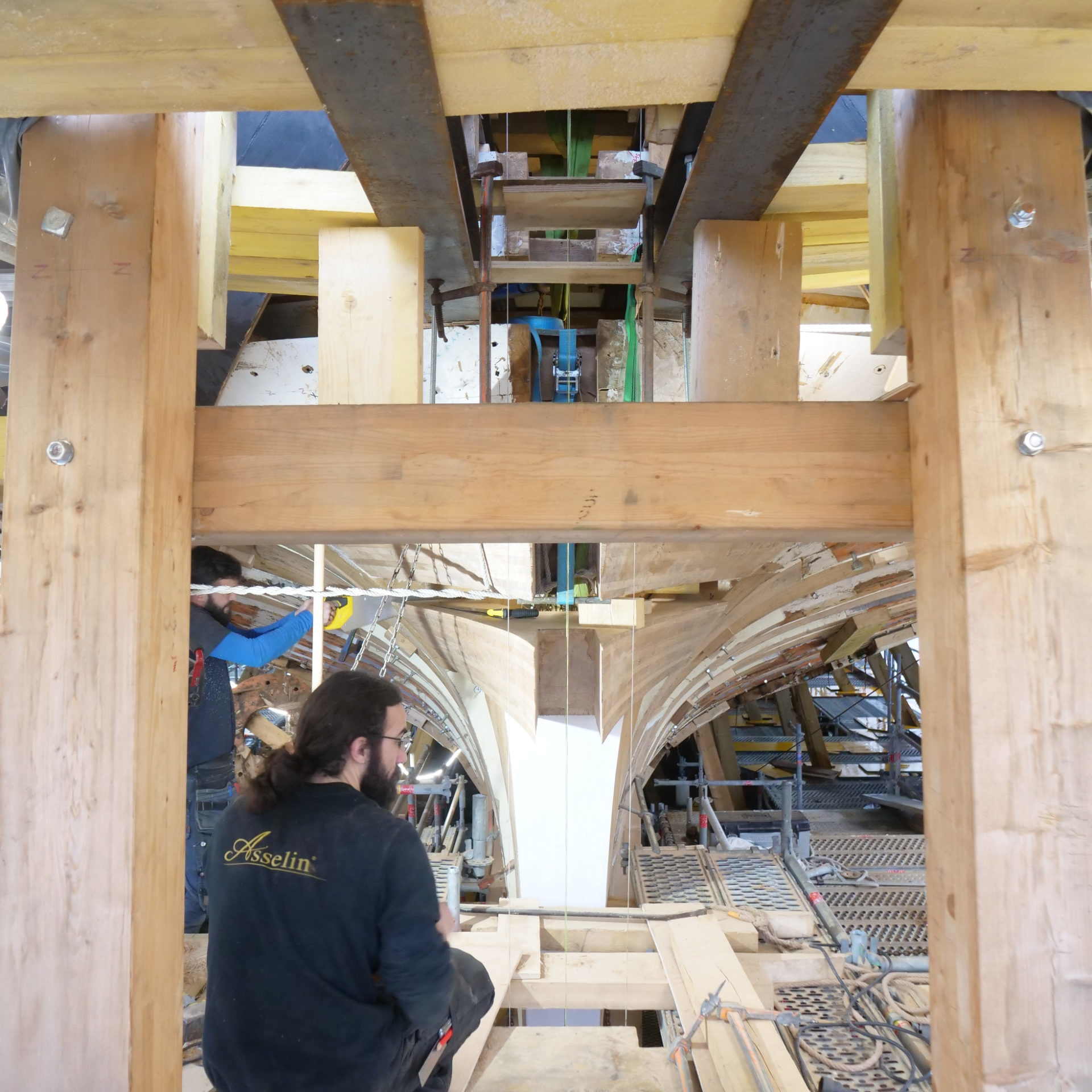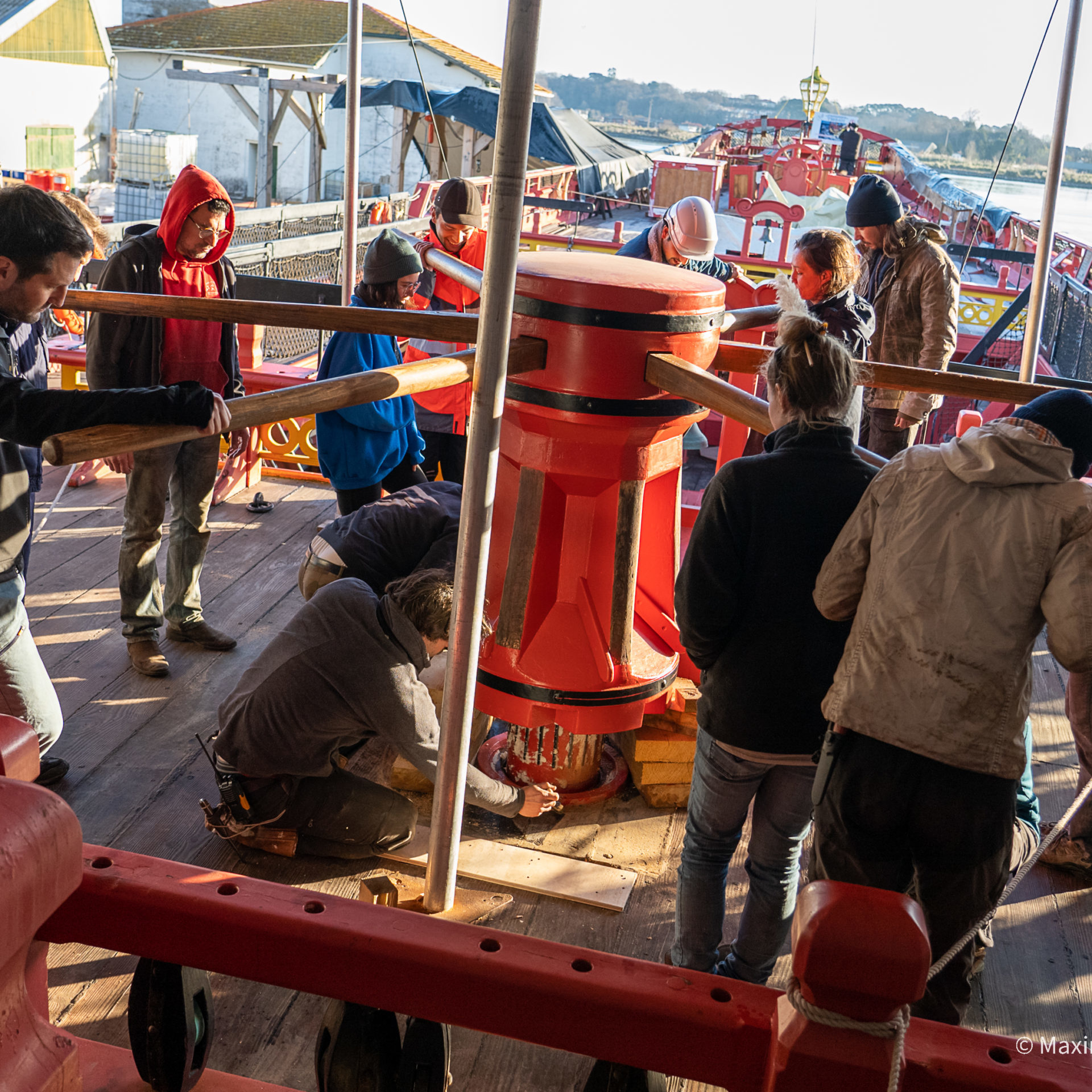 A l’avant du navire, 4 pièces en lamellé-collé et des pièces en bois massif seront posées par les équipes du chantier du Guip dans les prochains mois. Les pièces en question sont l’allonge inférieure de contre-étrave et d’étrave, l’alonge supérieure de contre-étrave et d’étrave. Elles sont en cours de façonnage et seront au préalable soumis au bureau d’études Véritas pour faire valider la technologie utilisée ainsi que sa qualité. Au total, 34 pièces de la structure interne seront remplacées, tandis que des pièces saines ont été déposées (pour pouvoir accéder au cœur de la coque) et devront ensuite être remises en place.