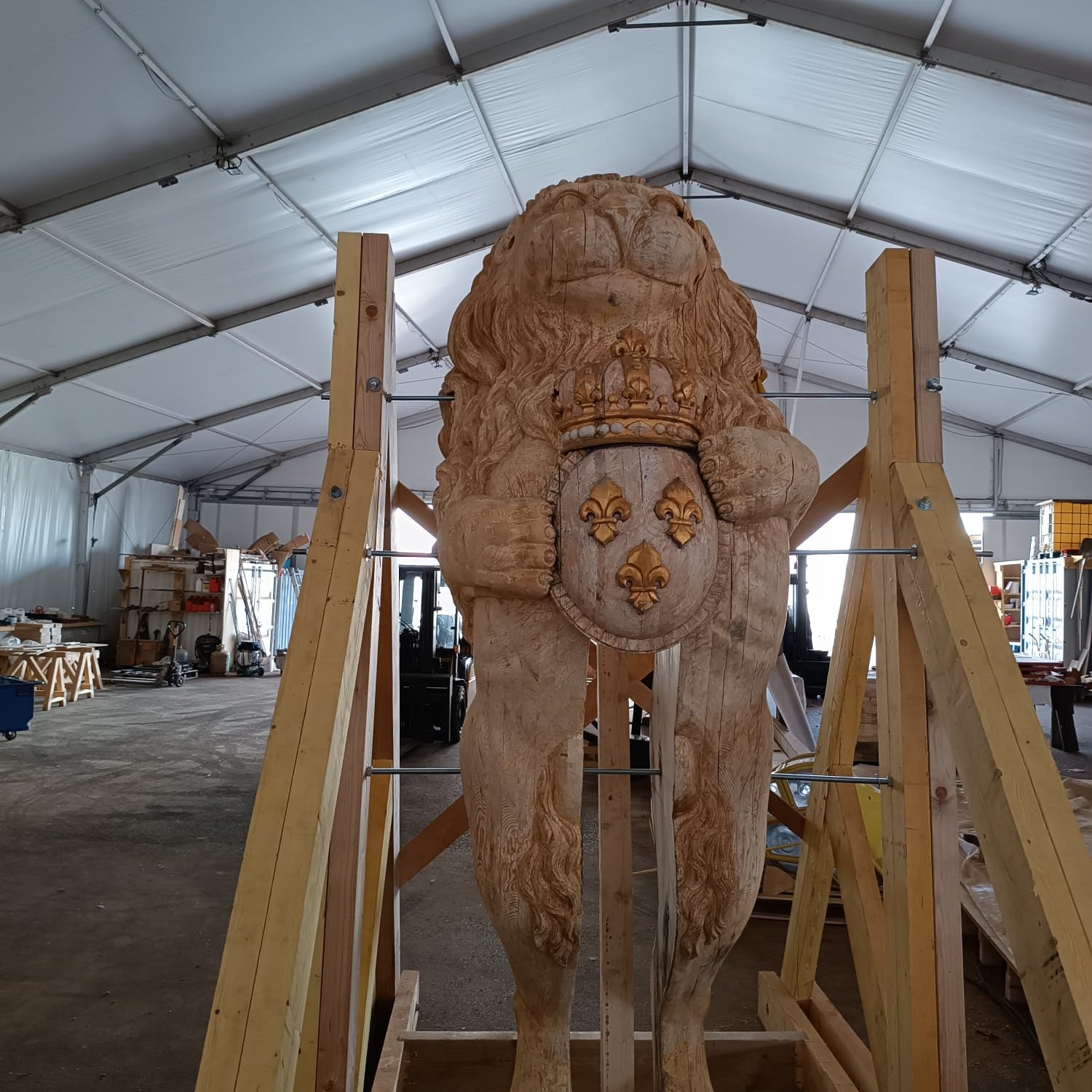 À l’arrière de L’Hermione, les travaux de restauration se poursuivent depuis plusieurs mois. Au total ce sont 49 pièces qui ont été réparées sur un total de 54 qui le nécessitait. La société Asselin va mettre en place dans les prochains jours la 4e barre d’arcasse. Cette pièce en bois a pour fonction de rigidifier la poupe du navire.