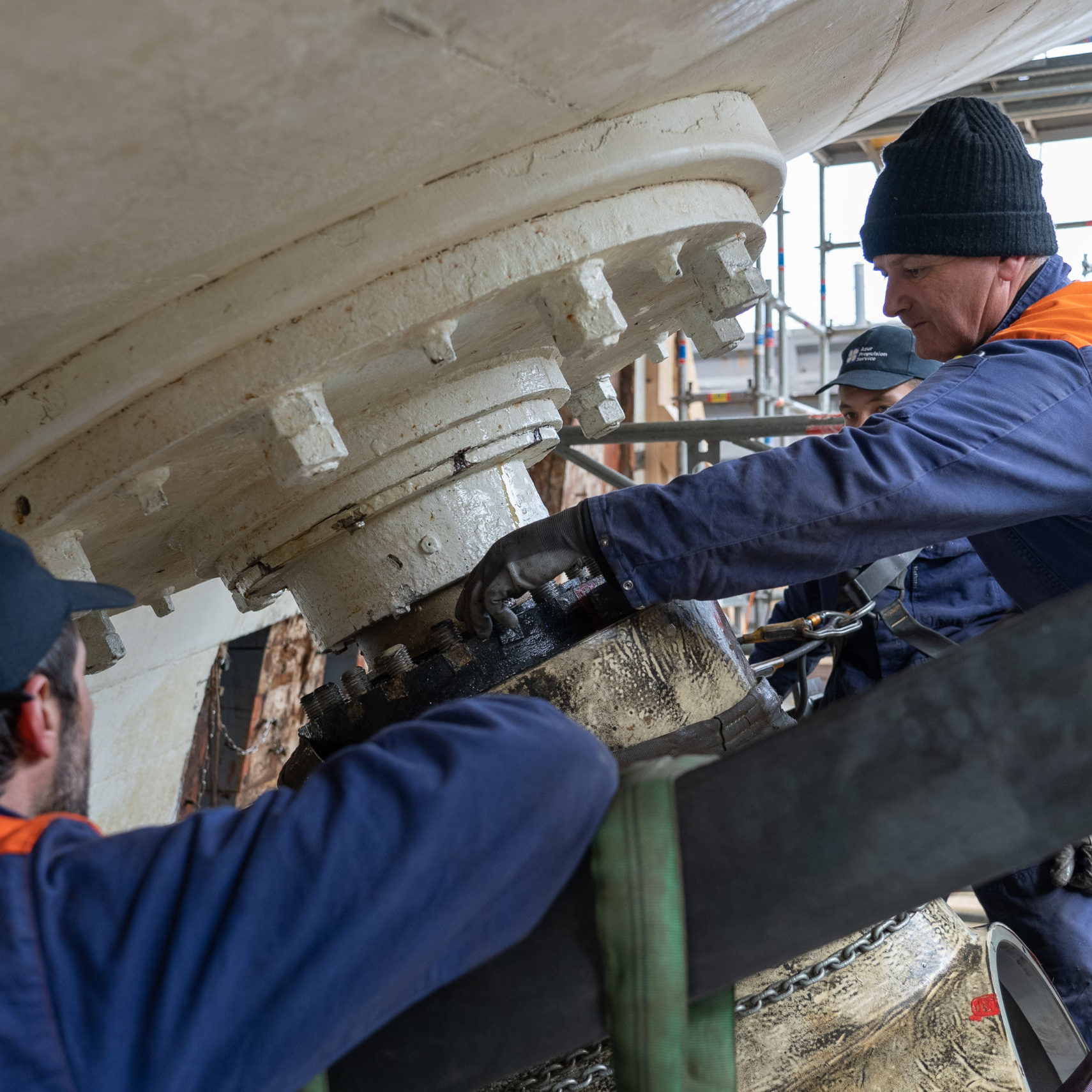 A l’occasion du Grand Carénage, le démontage intégral des deux propulseurs omnidirectionnels, plus souvent appelés « Pods », a été réalisé. Découvrez ce grand entretien des propulseurs, une étape importante qui permettra aussi à L’Hermione de reprendre la mer.