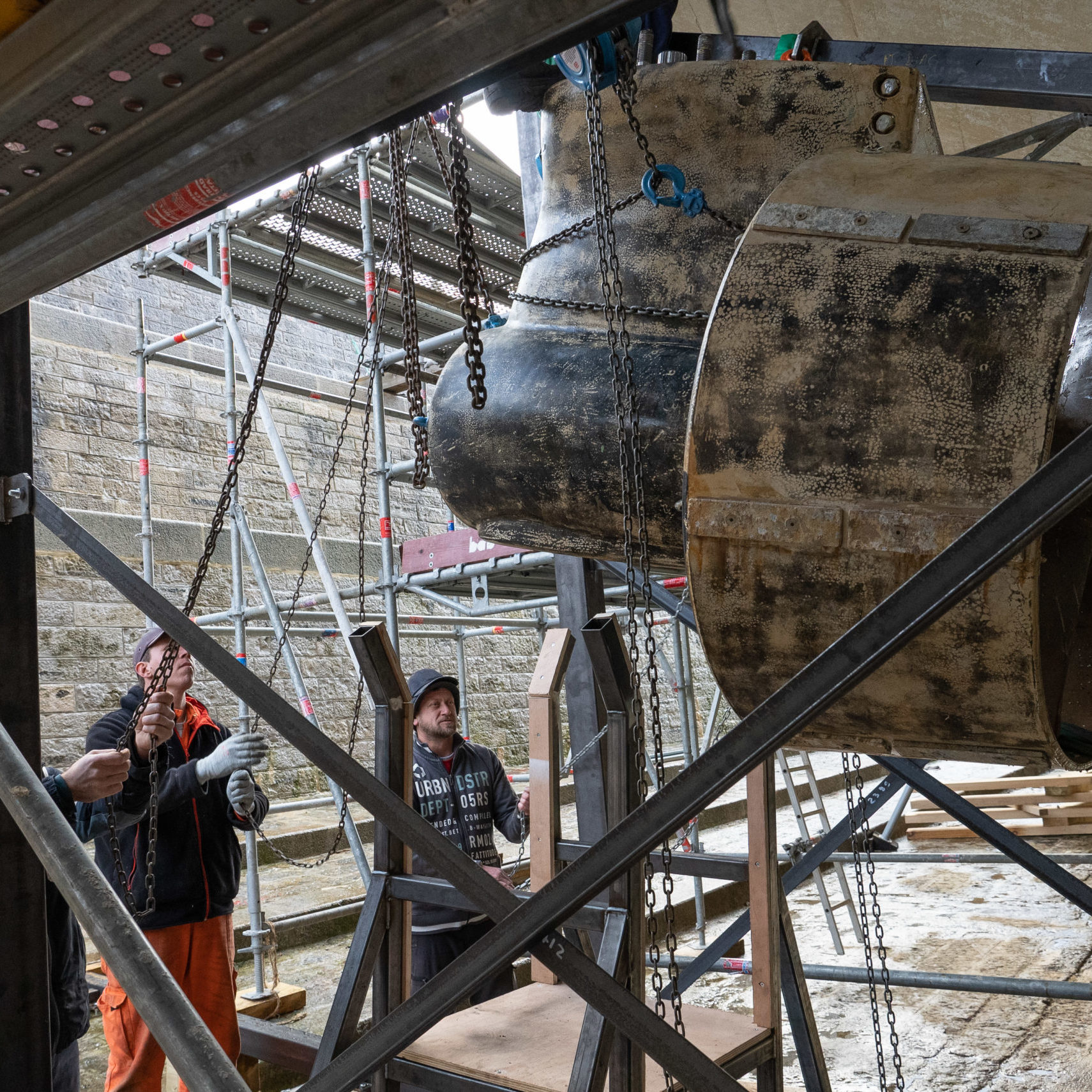 Les deux propulseurs ont été parmi les premières pièces à être démontées du bateau. L’Association donne la priorité aux travaux de restauration de la coque avant de financer l’achat des nouvelles pièces des propulseurs, qui seront réassemblés quelques mois avant la remise à l’eau du navire. Il faudra donc attendre la fin des travaux à l’arrière de la frégate pour pouvoir les remettre à leur place initiale.