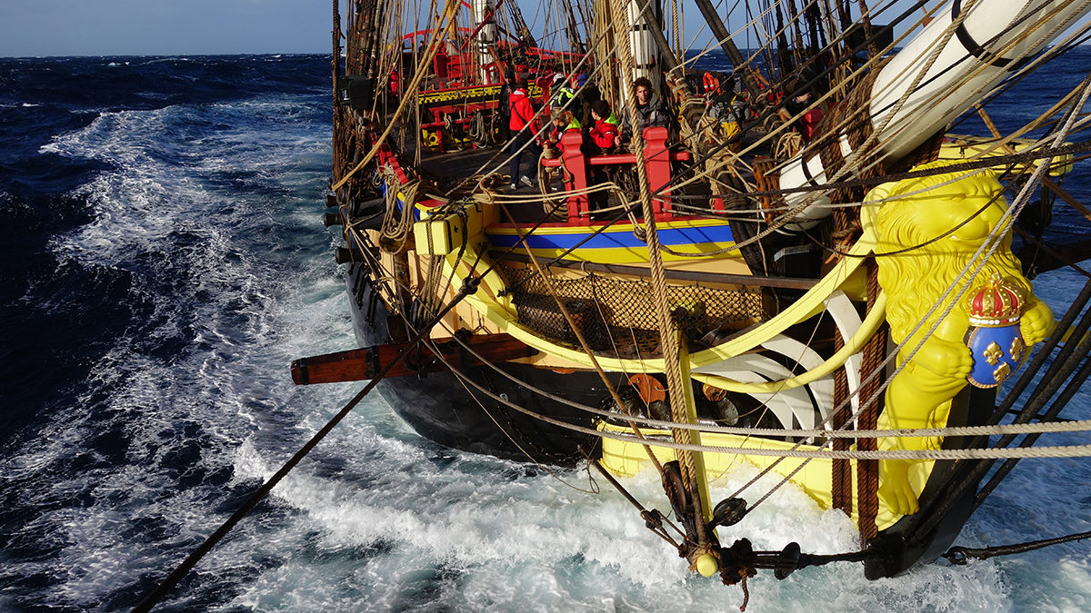 La tripulación profesional y los voluntarios se hacen cargo de la fragata y descubren sus extraordinarias cualidades náuticas.