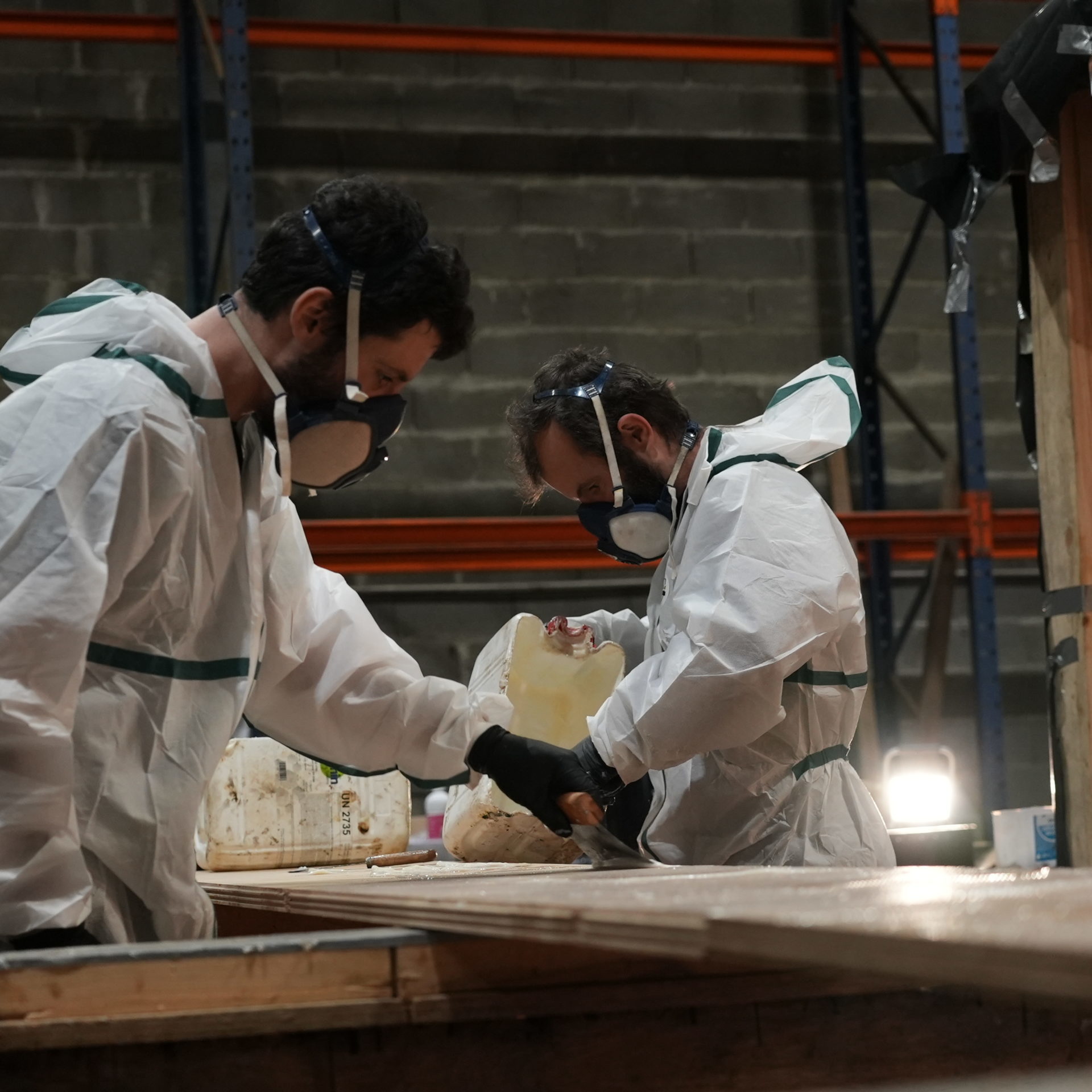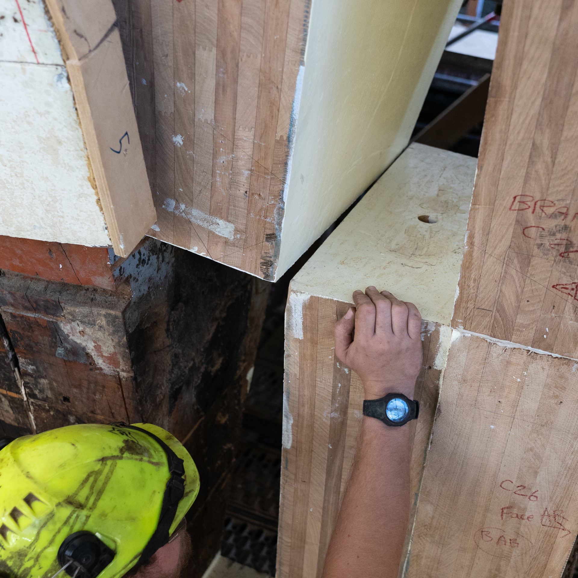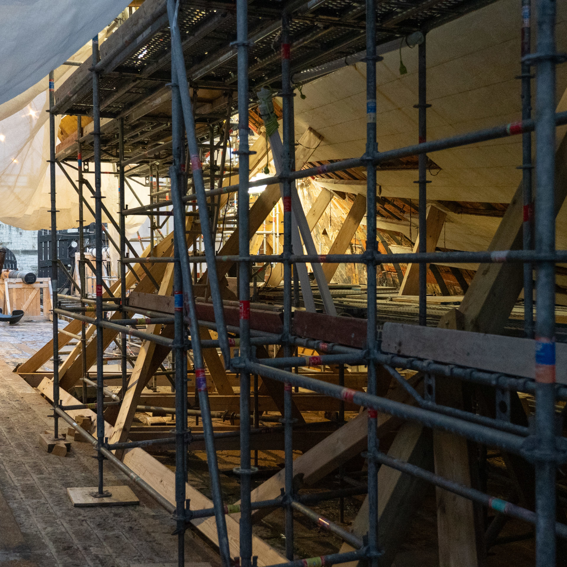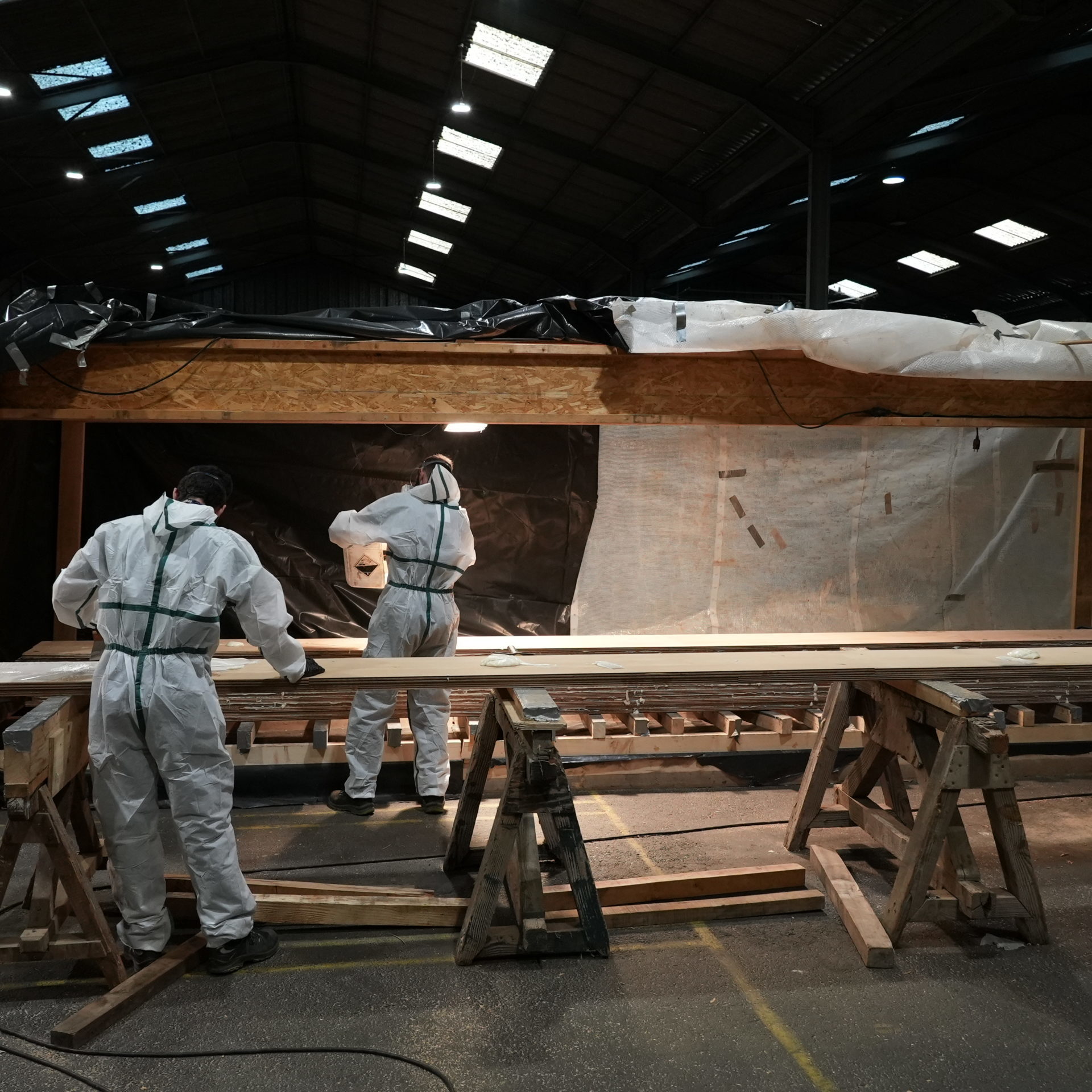 Suite au diagnostique il a été révélé que les zones atteintes par les champignons sont situées à l’avant et à l’arrière de la frégate. Il a été nécessaire ces derniers mois de procéder au démontage de ces zones atteintes. Retrouvez toutes les informations à ce sujet dans notre précédent article. Aujourd’hui, les nouvelles pièces en bois de la coque sont fabriquées en lamellé collé.