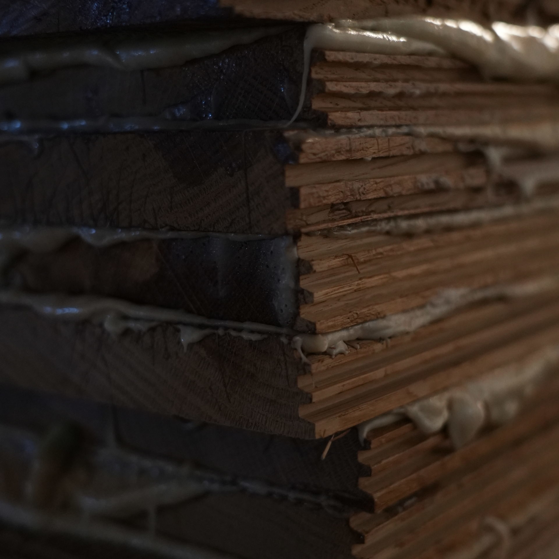 C’est une technique de fabrication des pièces qui s’obtient par collage de plusieurs lamelles de bois. Cela permet la fabrication de pièces de grandes dimensions et de formes particulières. Cela permet également d’avoir des pièces de bois sec à cœur puisque chaque planche a pu sécher indépendamment des autres.