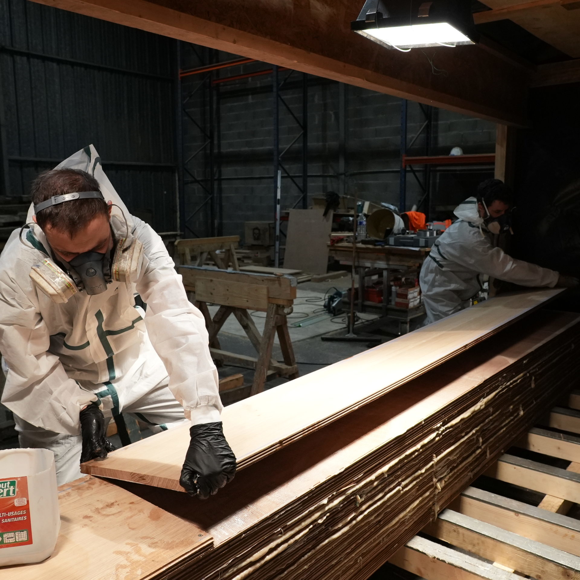 Toujours avant de lancer la fabrication des pièces, un tracé sur logiciel informatique est créé par les équipes d’Asselin. Lors de cette phase, on tient notamment compte du sens du bois dans l’imbrication des pièces les unes dans les autres. Vient ensuite la fabrication des gabarits avec du contreplaqué. Cela permet de visualiser concrètement la dimension de la future pièce et d’adapter sa taille si besoin avant de la fabriquer.