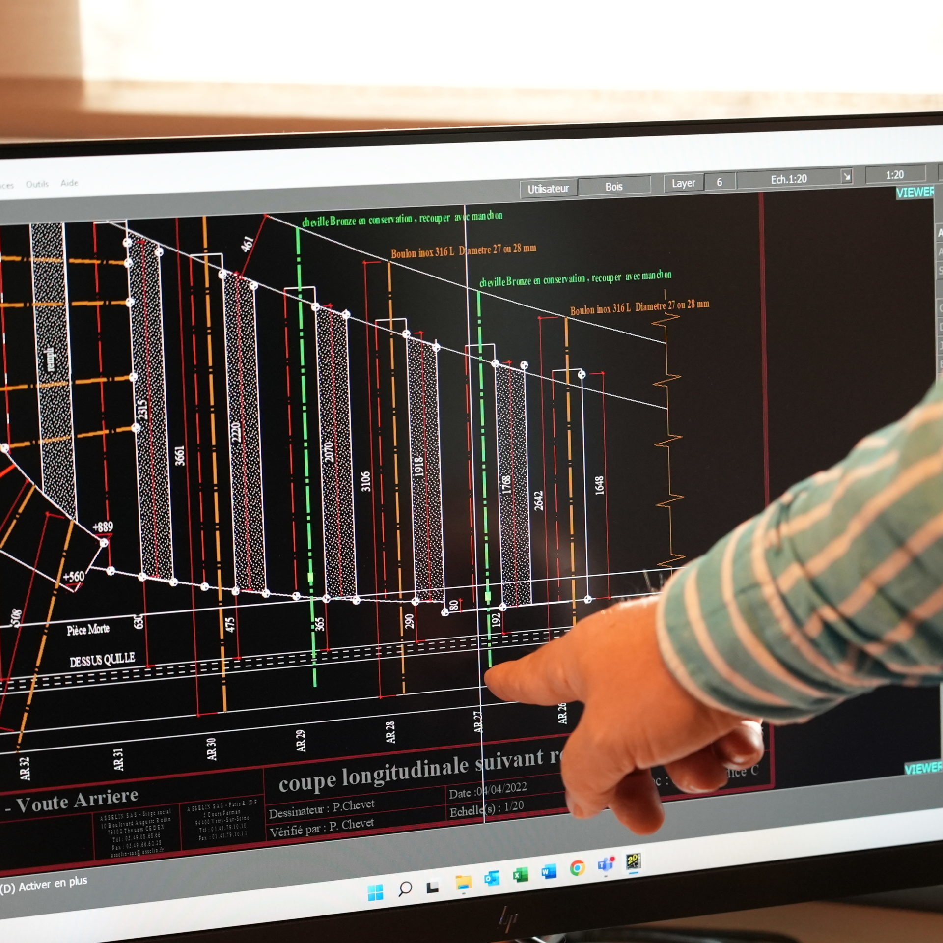Tout d’abord, un important travail préparatoire est nécessaire avant même de lancer la construction d’une pièce. Des prises de mesures et des relevés sur L’Hermione sont réalisés par les charpentiers du Guip et d’Asselin à Anglet. Cela permet de connaître en amont le volume de bois nécessaire et de le réserver auprès de la scierie (pour les pièces fabriquées par Asselin à l’arrière, il s’agit de la scierie Ducerf).