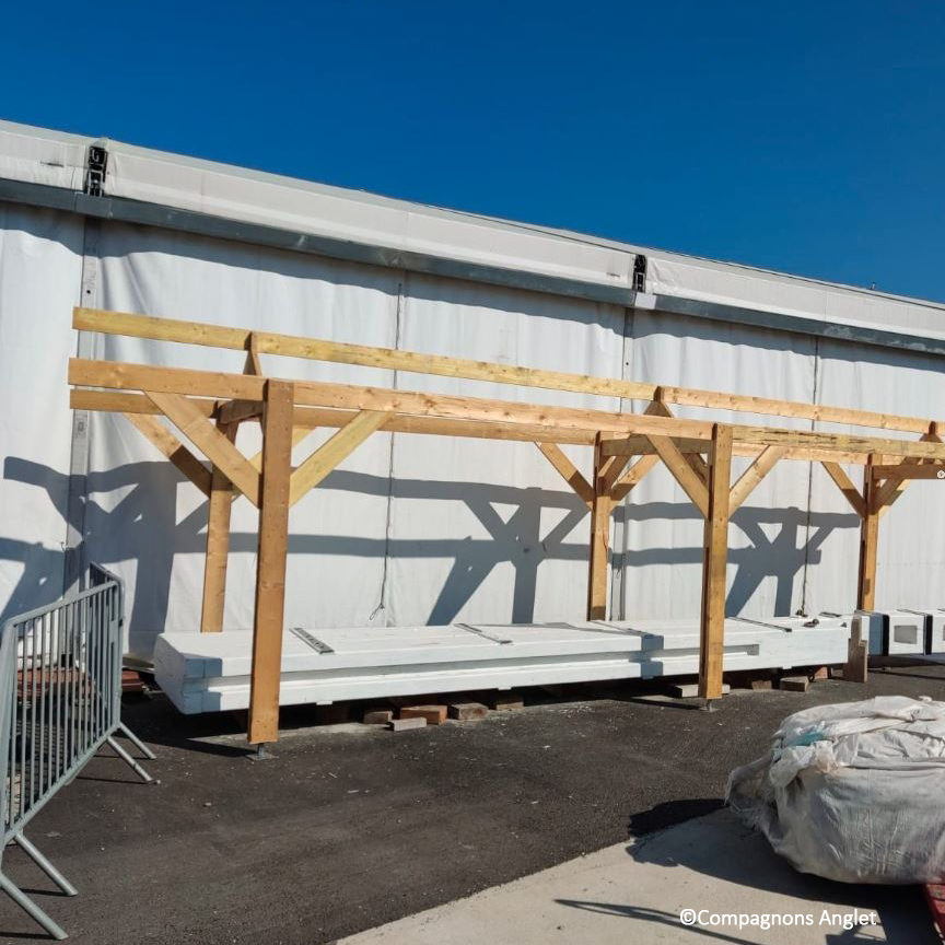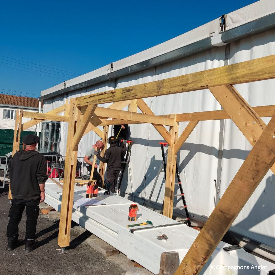 Comme l’ensemble de la frégate, le safran est couramment entretenu pour garantir sa fiabilité et sa longévité. Depuis sa dépose, le safran de L’Hermione a été mis à l’abri du soleil et des intempéries. Pour disposer d’un espace de travail adapté permettant également de protéger le safran, les apprenants en Titre professionnel continu charpente des Compagnons du Tour de France d’Anglet ont conçu puis installé un abris sur-mesure, sur le quai qui jouxte la forme de radoub du port de Bayonne.