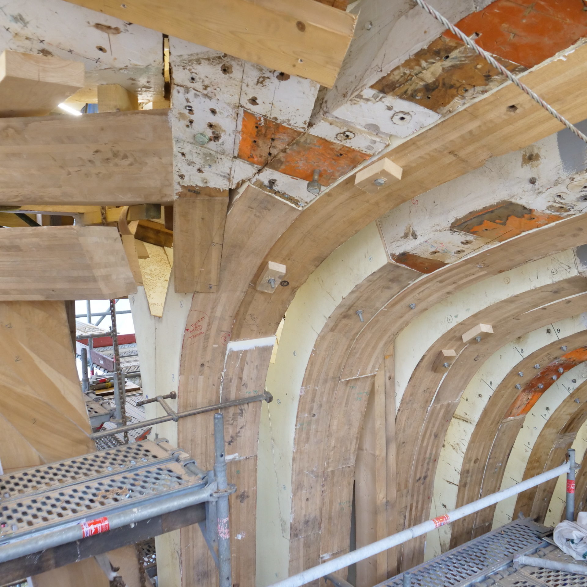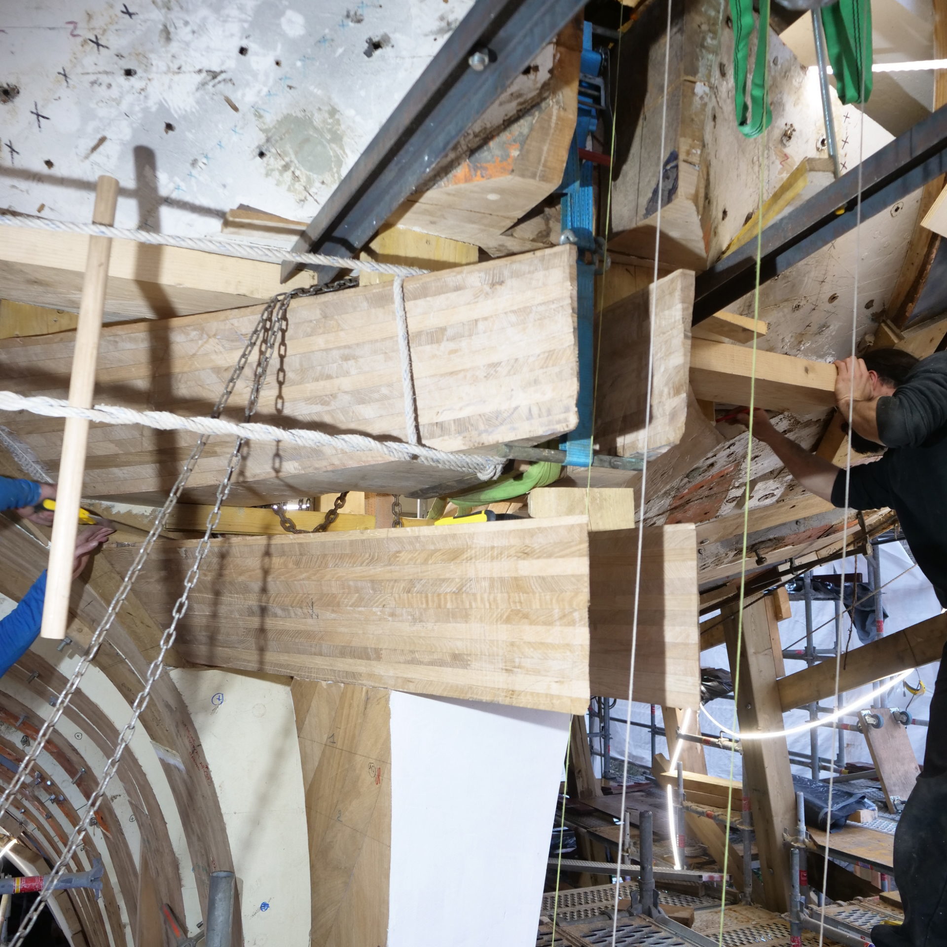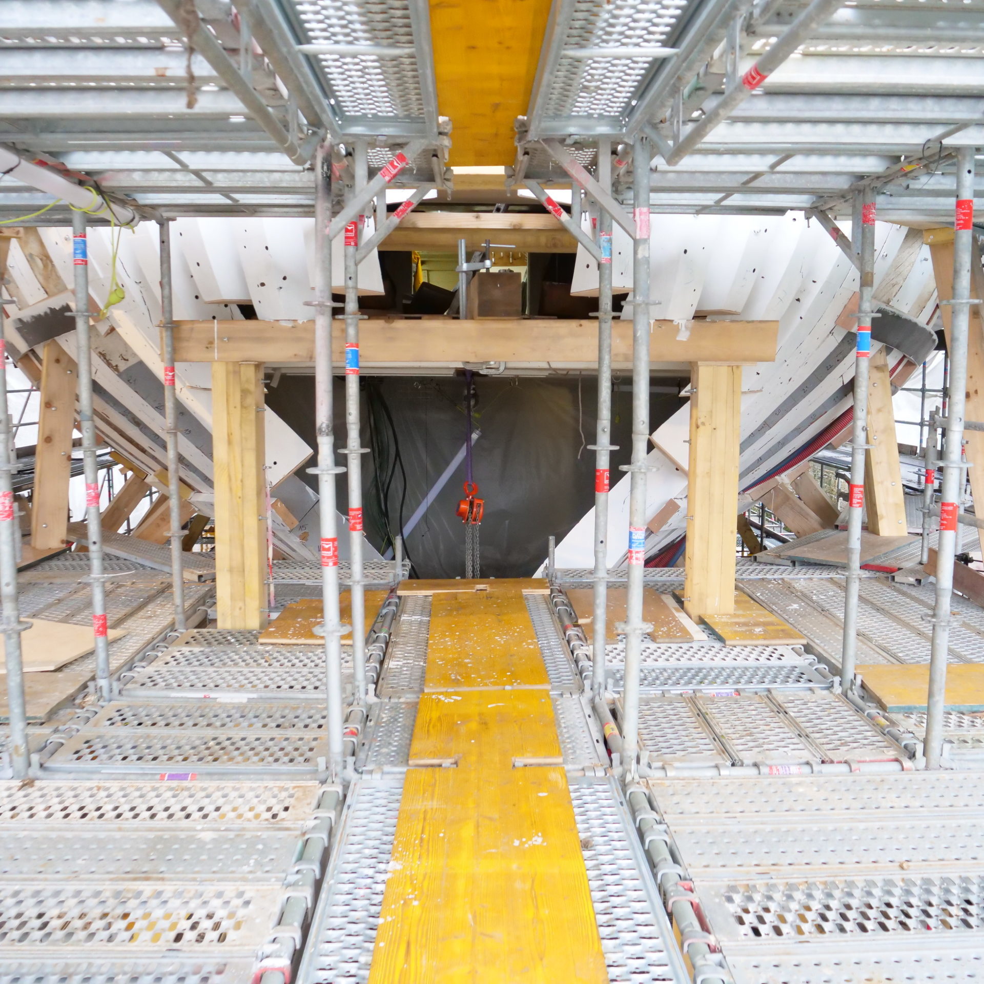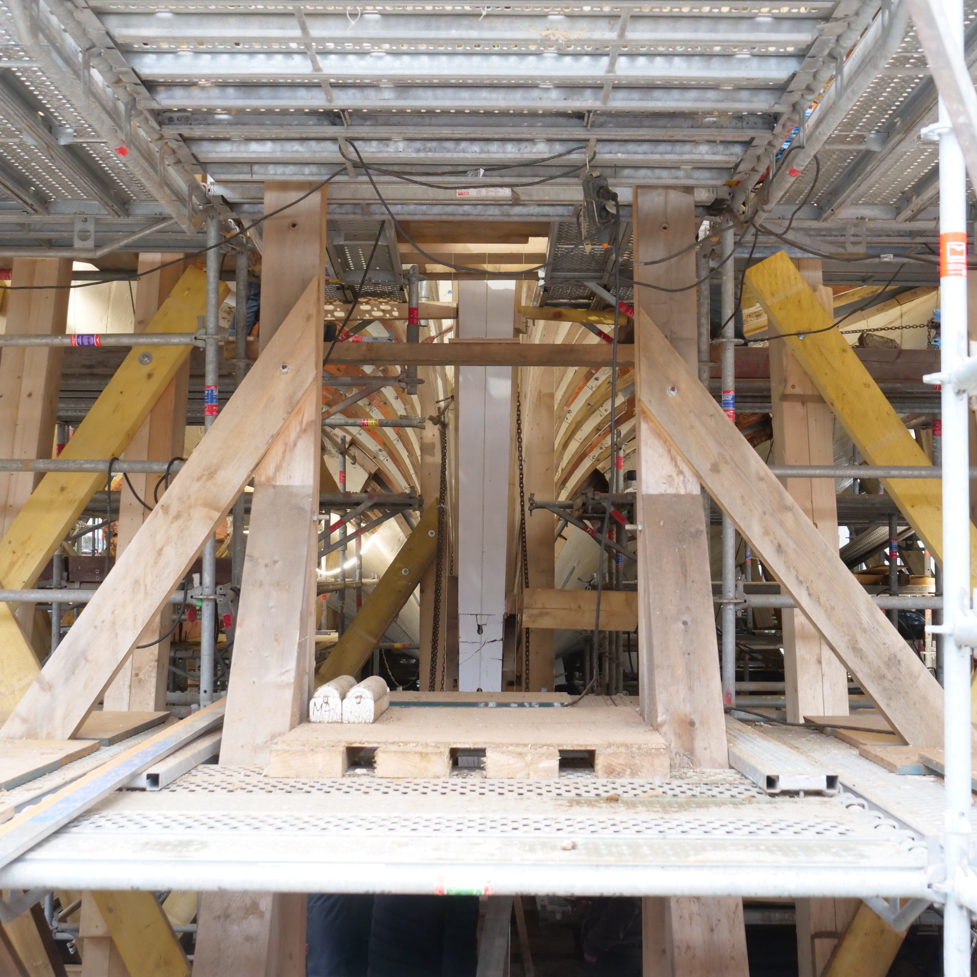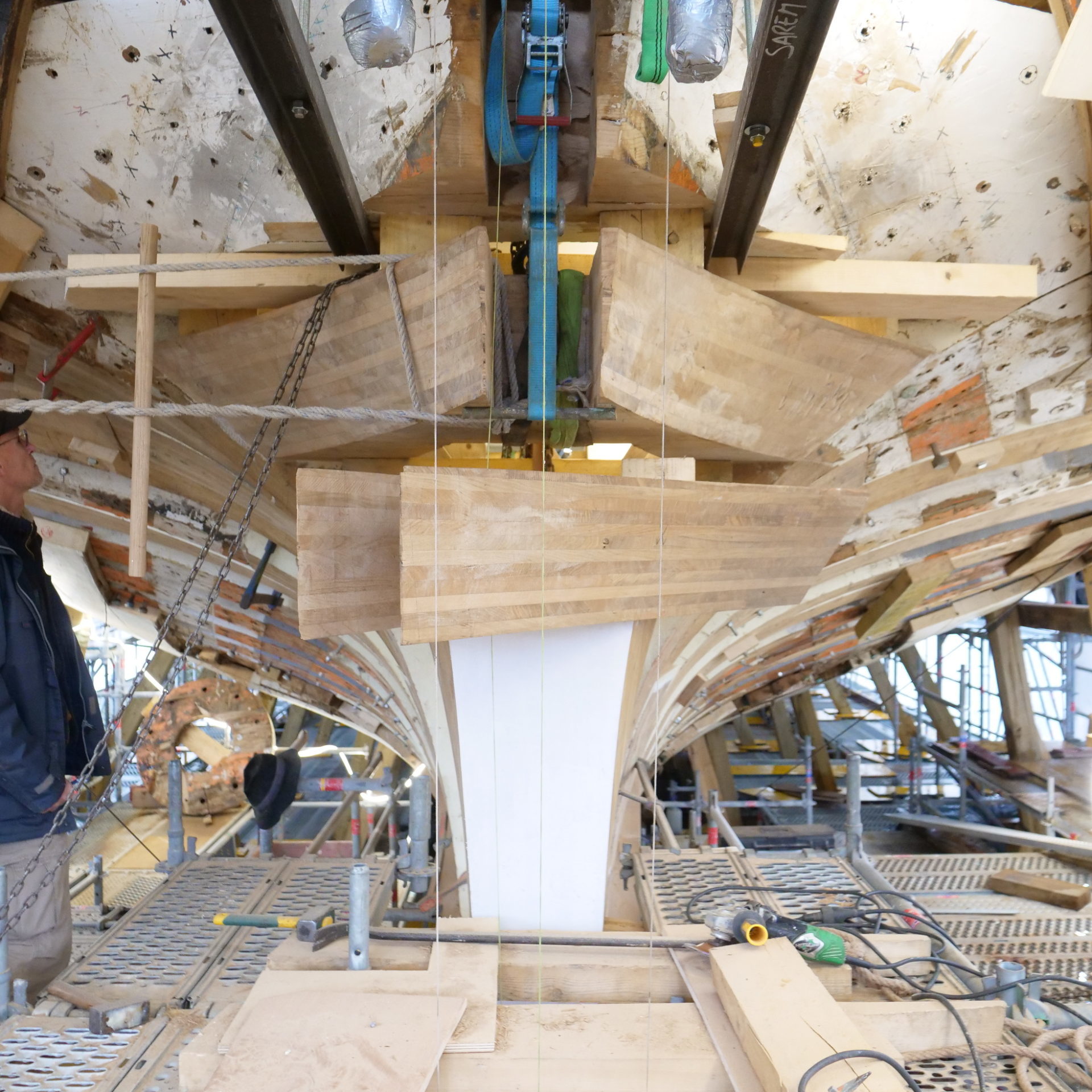 Préalablement à chacune de ces opération, des épontillages (poutres en bois qui maintiennent la coque) ont été ajoutés, modifiés et/ou renforcés pour maintenir la structure du navire. L’objectif est de pouvoir changer des pièces aux dimensions impressionnantes sans fragiliser les parties supérieures de la frégate.