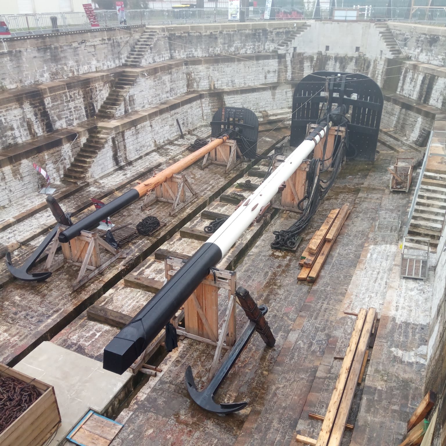 Le saviez-vous ? C’est grâce à la sapine (un ascenseur déporté en bois) réalisé par les compagnons du tour de France que la majorité des pièces sont minutieusement descendue au fond de la forme de radoub du port de Bayonne. La descente de l’étambot et du contre-étambot feront exception, elles nécessiteront un grutage spécifique.
